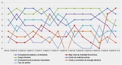 En primer lugar se encuentra el bajo nivel de actividad económica, el cual había descendido en importancia durante los dos últimos trimestres del año pasado y el primero del presente año, pero ascendió fuertemente al pasar del octavo lugar en el trimestre enero-marzo 2019 al segundo lugar en el trimestre abril-junio 2019, y ahora al primer lugar (julio-septiembre 2019) alcanzando una incidencia de 17%.