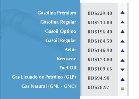 En cambio, el galón de fuel oil se sitúa en RD$109.66, baja RD$0.40, el gas licuado de petróleo (GLP) pasa a costar RD$94.90 por galón, sube RD$0.90. Mientras que el gas natural mantiene su precio de RD$28.97 por metro cúbico.