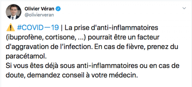 Para el ministro de sanidad francés, Olivier Véran, el uso de ibuprofeno y otros antiinflamatorios no esteroideos podrían influir negativamente en la evolución de los pacientes infectados por el coronavirus Covid-19. « Si tienes fiebre, toma paracetamol. Si ya estás tomando antiinflamatorios o tienes dudas, consulte a su médico”, afirmó