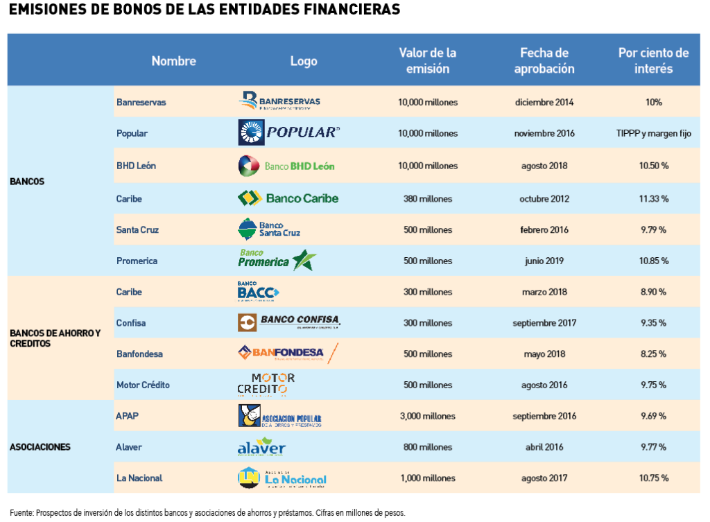 Bancos múltiples, bancos de ahorro y crédito, y asociaciones de ahorros y préstamos completan el panorama de las opciones de inversión en renta fija disponibles. Algunas emisiones pagan tipos definidos desde el principio, otras se acogen a las indexaciones variables que se componen de un margen fijo en adición al TIPPP o tasa de interés nominal pasiva promedio ponderada para certificados financieros y/o depósitos a plazos de los bancos múltiples, un promedio obtenido a partir de lo que pagan los certificados bancarios dominicanos, el cual se registra trimestral o semestralmente, en relación con el programa de emisión de valores del que se trate.