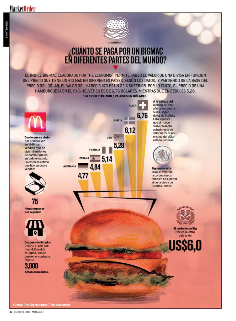 El índice Big Mac elaborado por The Economist permite saber el valor de una divisa en función del precio que tiene un Big Mac en diferentes países. Según los datos, y partiendo de la base del precio del dólar, el valor del marco suizo es un 22 % superior. Por lo tanto, el precio de una hamburguesa en el país helvético es de 6,76 dólares, mientras que en EEUU, ES 5,28.