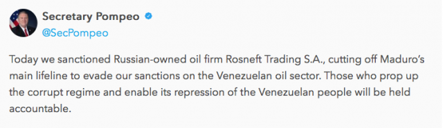 Rosneft está actualmente sujeto a algunas sanciones del sector de mercado de EE.UU., aunque esas medidas no son tan amplias como las sanciones contra las empresas asociadas con el régimen de Maduro y no impiden que Rosneft realice transacciones relacionadas con el petróleo venezolano.