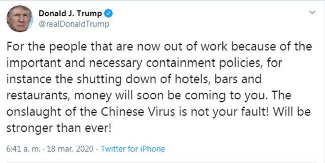 Junto con ello, tuiteó a los estadounidenses que enfrentan dificultades económicas causadas por la pandemia que “el ataque del virus chino no es tu culpa”.