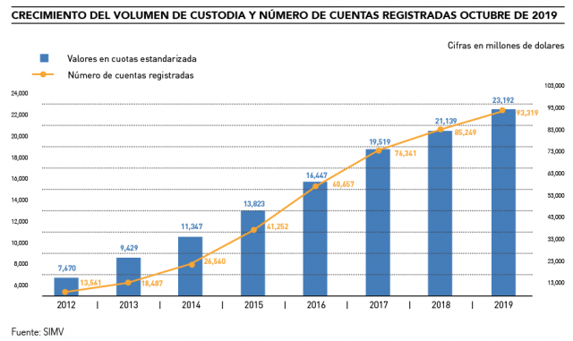 Otras dos consideraciones destaca la SIMV sobre la evolución del mercado en 2019: el portafolio de los fondos de inversión, que incluye edificios corporativos, estaciones de servicio, sucursales bancarias, sociedades constructoras y hoteles, y los fideicomisos de oferta pública, que al cierre de noviembre tenían un monto aprobado de US$37,235.4 millones.