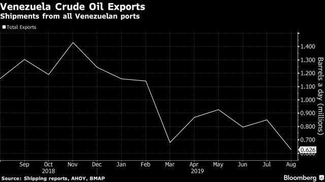 Las exportaciones de crudo, la moneda que financia el gobierno de Nicolás Maduro, cayó a un mínimo de 16 años en agosto a medida que los compradores, incluida la empresa india Reliance Industries Ltd, limitan sus compras de barriles venezolanos.