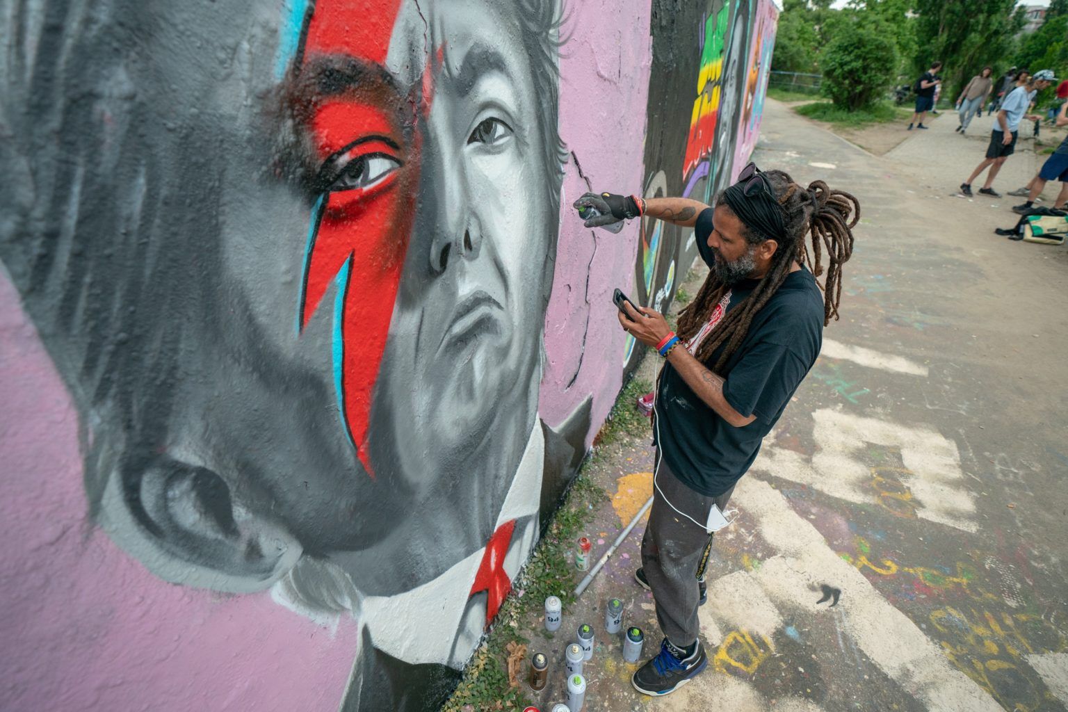 Todavía queda en pie un tramo de muro, donde los grafiteros dan rienda suelta a su creatividad y Eme Freethinker se dispone a plasmar su próxima obra.