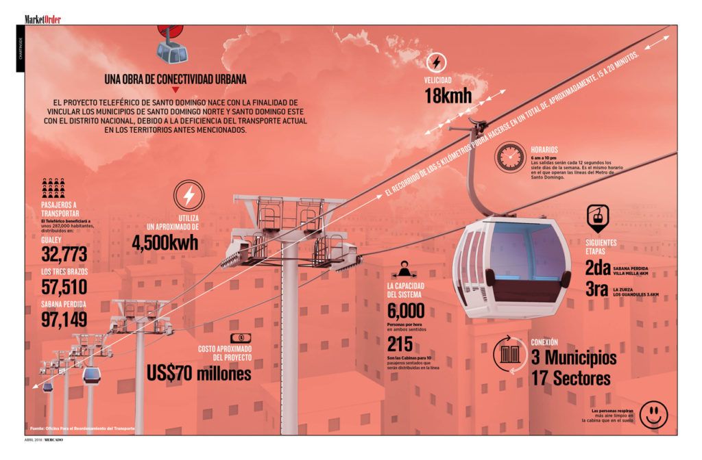 El Teleférico de Santo Domingo tuvo un costo aproximado de US$70 millones. Transporta a los pasajeros a una velocidad de 18 kilómetros por hora.