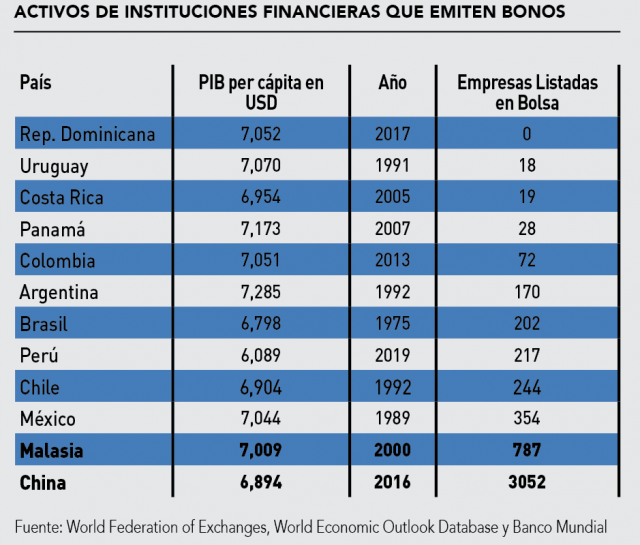 A pesar de que nuestro mercado de valores cuenta con casi 20 años de legislación especial, aún no hemos podido desarrollar uno de los ejes más importantes del mercado que es la emisión pública de acciones. Pareciera mentira, pero la República Dominicana es uno de los pocos países de Latinoamérica (quizás el único), que no ha logrado colocar acciones en un mercado público. En la tabla que acompaña este artículo se puede comparar la situación en la región, tomando en consideración los años específicos en que estos países contaban con un PIB per cápita comparable al de nuestro país y la cantidad de empresas que ya estaban siendo comercializadas en un mercado público.