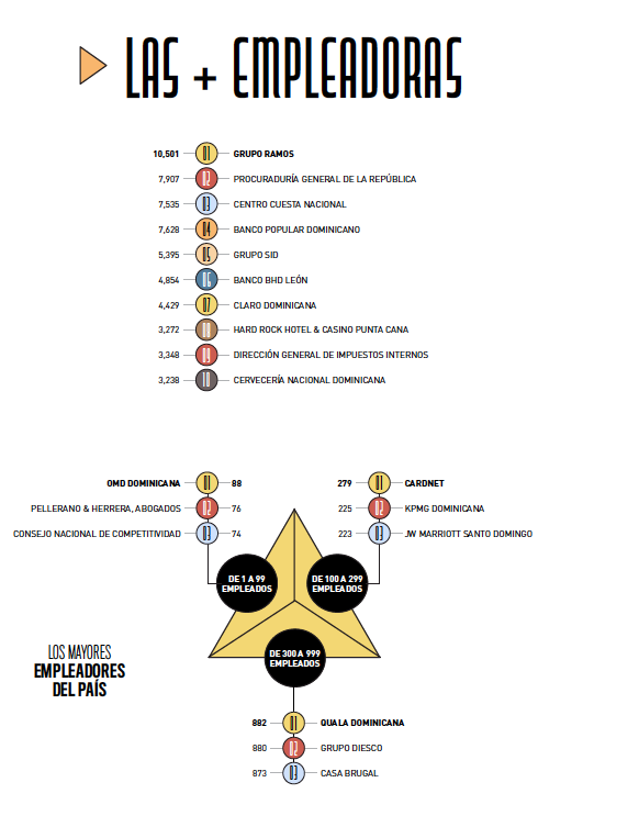 El mayor empleador del país, el Grupo Ramos, contaba con 10,500 trabajadores en su nómina, al cierre de 2018, el año sobre el cual se realiza este estudio. Con sus dos cadenas de supermercados y presencia nacional, absorbe una gran cantidad de fuerza laboral y su posición como líder en generación de puestos de trabajo es ya tradicional en la economía dominicana.