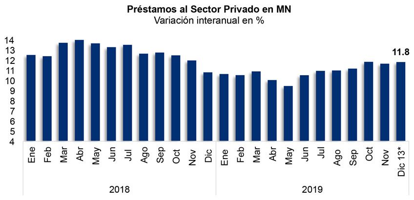 La tasa de crecimiento interanual, se ubica en torno a 12.0% de diciembre de 2018 a la última fecha disponible de diciembre 2019, por encima de la expansión del PIB Nominal estimada para este año.