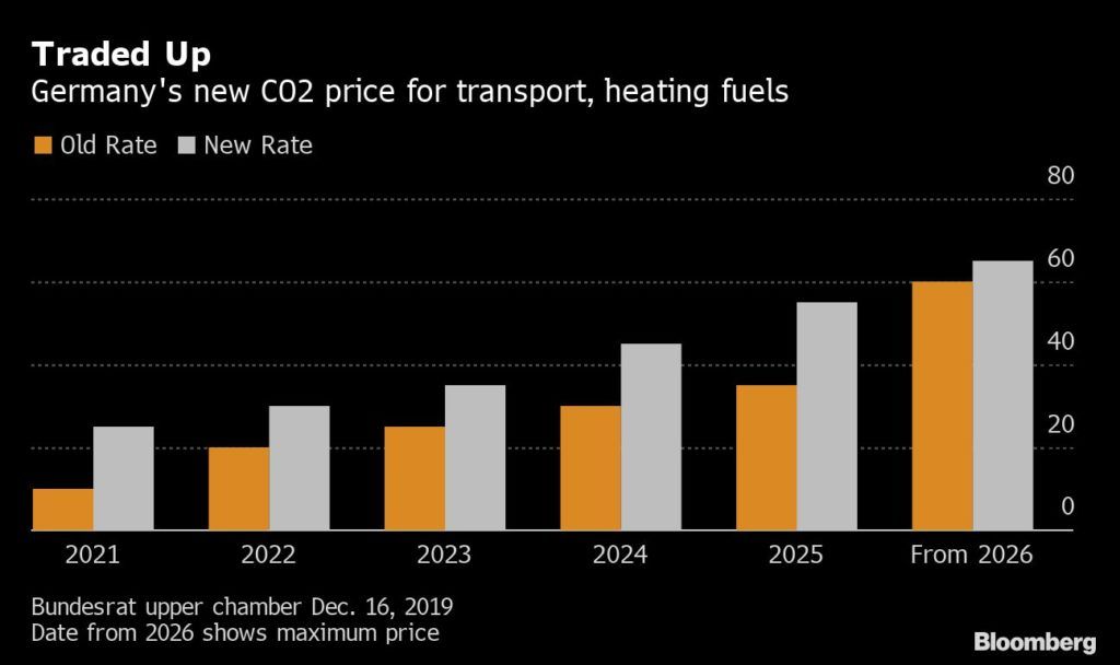 Los políticos de los 16 estados de Alemania llegaron a un acuerdo preliminar durante el fin de semana para aumentar en más del 100% un nuevo impuesto sobre las emisiones de dióxido de carbono del transporte y la calefacción, según un documento al que ha tenido acceso Bloomberg News. Los consumidores de la mayor economía de Europa ahora se enfrentan a un recargo de 25 euros la tonelada en lugar de los 10 euros la tonelada inicialmente propuestos. La prima de contaminación aumentará a 55 euros para 2025, un salto de casi un 60% respecto a la propuesta original.