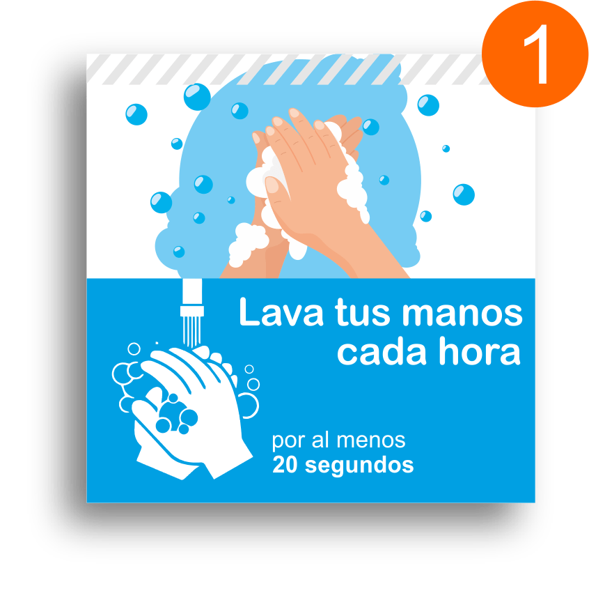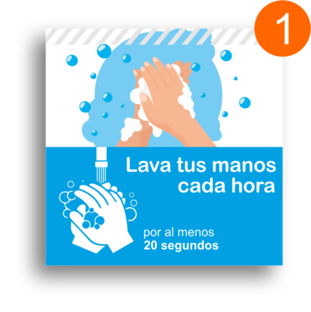 • 1 Adhesivo recordatorio de lavarse las manos cada hora (25cm x 25cm)