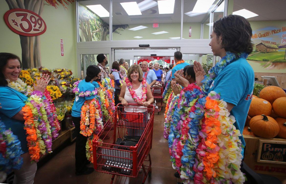 En Tj´s cuando abren una tienda, los miembros de la tripulación hacen un pasillo y reciben a sus amigos clientes con collares Hawaianos.