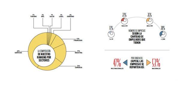 En las 80 empresas seleccionadas hay diez que ocupan entre una y 99 personas; 17 entre cien y 299 empleados; 20 hasta 999, y 33 que superan los mil trabajadores. De igual manera, hay 31 que prestan diferentes servicios, 17 dedicadas al comercio, 15 industriales, 11 del sector financiero, tres de carácter estatal y tres de otros sectores.